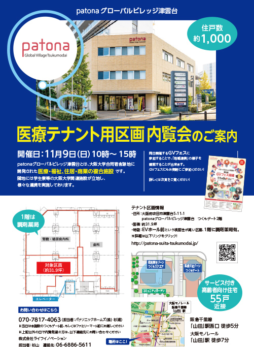 ・patonaグローバルビレッジ津雲台とは、大阪大学合同宿舎跡地に開発された医療・福祉、住居・商業の複合施設です。隣地には学生寮等の大阪大学関連施設が立地し、様々な連携を実施しております。各種施設や地域連携が充実した本テナントで医療開業してみませんか?